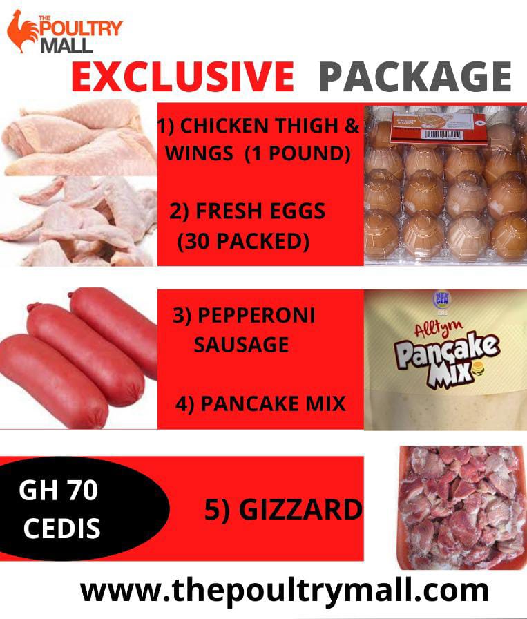 Our Exclusive Combo Package contains a pound of chicken thighs & wings, 30 Packed Fresh Eggs, Pepperoni Sausage and pancake mix
