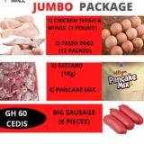 Jumbo Package contains a pound of chicken thighs and wings, 12 Packed Fresh Eggs, Gizzard, Pancake Mix & Pepperoni Sausage.